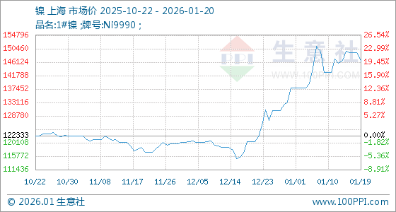 1月20日,生意社镍基准价为146416.67元/吨,与本月初(137733.33元/吨)相比,上涨了6.30%。