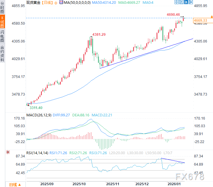 汇通财经APP讯——周二(1月20日)亚市时段,现货黄金于每盎司4670美元附近窄幅震荡,接近历史高点,现货黄金本周开局便呈现出明显的看涨倾向,周一涨幅超过1.5%,一度触及4690.46美元/盎司的历史新高。短期内,由于美国政府近期就与格陵兰岛未来相关分歧可能对欧洲重新加征关税的言论,加剧了地缘政治不确定性,从而提振了新的需求。