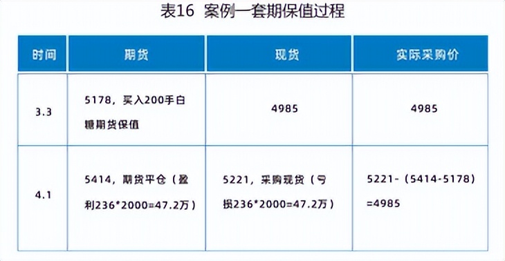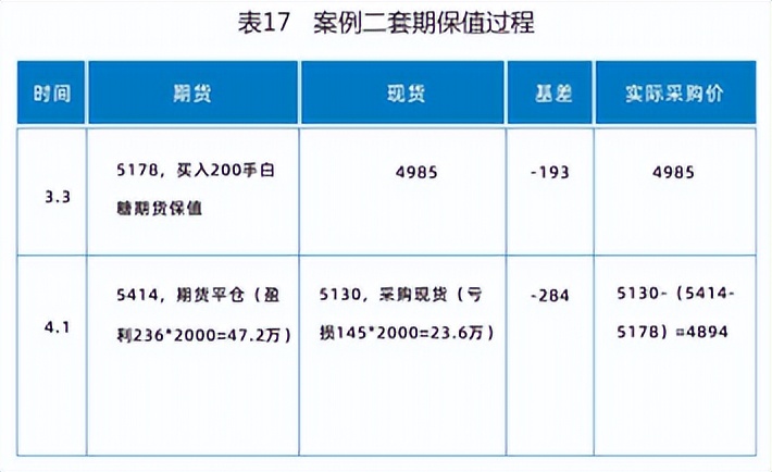 2021年3月初,某食品厂为4月份生产备货,需要采购原料2000吨白糖,此时白糖的现货价格4985元/吨、期货SR2109价格是5178元/吨。因考虑未来价格上涨,该企业在期货上买入200手SR2109白糖期货。等到4月初,将期货头寸平掉,并买入了现货。此时期货价格是5414元/吨,现货价格是5138元/吨。由于期货上涨幅度大于现货上涨幅度,即基差走弱,因此4月份的最终白糖采购价还低于3月初未涨价前的现货价格,即套保带来了额外的基差收益。