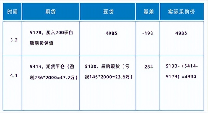 2021年3月初,某食品厂为4月份生产备货,需要采购原料2000吨白糖,此时白糖的现货价格4985元/吨、期货SR2109价格是5178元/吨。因考虑未来价格上涨,该企业在期货上买入200手SR2109白糖期货。等到4月初,将期货头寸平掉,并买入了现货。此时期货价格是5414元/吨,现货价格是5138元/吨。由于期货上涨幅度大于现货上涨幅度,即基差走弱,因此4月份的最终白糖采购价还低于3月初未涨价前的现货价格,即套保带来了额外的基差收益。