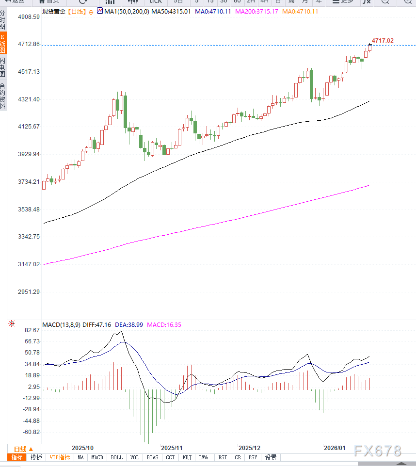 从日线结构观察,黄金形成的上升通道保持完好,价格已逼近通道上沿约4720美元区域。MACD快线持续位于信号线上方且双线处于零轴之上,正柱状图扩张,表明多头仍掌控节奏。
