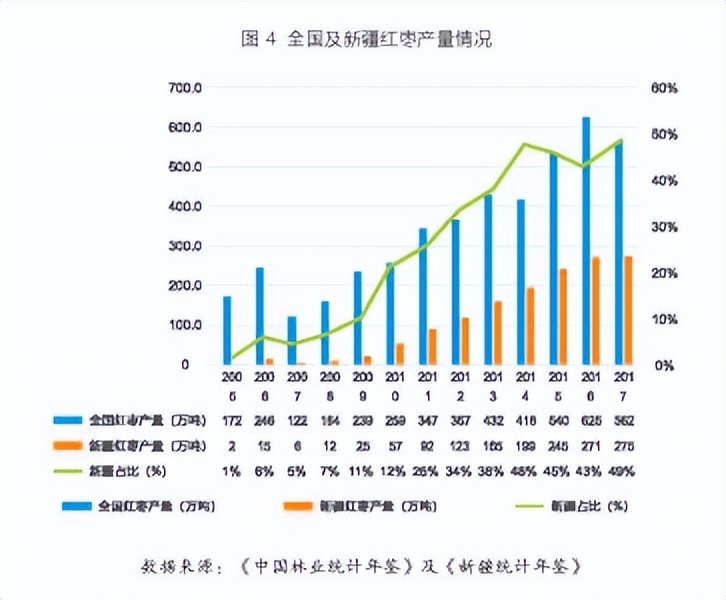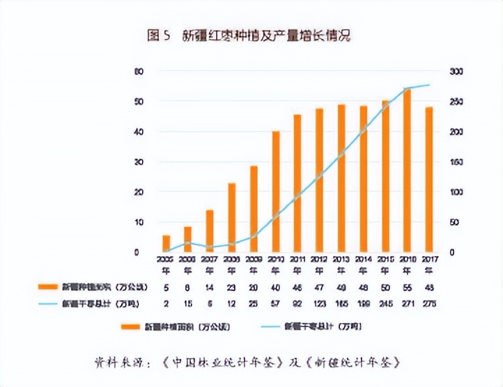 2005-2011年间,新疆枣树种植面积快速增长。2012年以来,新疆红枣供应持续增长、价格有所下滑、种植收益随之降低。为促进红枣产业持续健康发展,新疆地方政府提出林果产业尤其是红枣产业提质增效、控制产量"发展战略,截至2017年,新疆枣树种植面积逐渐稳定在40-50万公顷左右的水平,红枣产量逐步稳定在270万吨左右的水平。