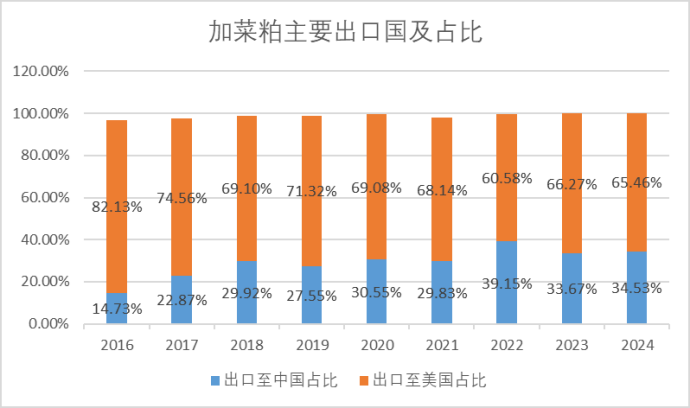 从加拿大国内的情况来看,除开油菜籽原料本身出口受中国影响较大以外,油厂压榨后的菜粕出口也同样受我国影响较大,从近些年加菜粕主要出口国及占比来看,加拿大菜粕出口至中国的数量占其年度总出口量的1/3左右。相反,近年来加菜油出口重心已完全转移至美国,这也是为什么加拿大方面还希望从3月1日起至至少年底,对加拿大菜籽粕征收的关税能够降低或取消,却并未提及菜油。