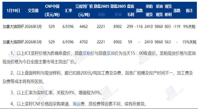受中加贸易趋紧的影响,菜籽进口也明显收缩,随着加籽库存清零,澳籽尚未开机压榨,沿海油厂已连续两个月处于停机状态,供应趋紧支撑下,利好国内菜系市场价格。而加菜籽在产量增加且出口受阻的双重压力下,价格相对偏弱。进而使得加菜籽进口压榨利润持续向好。据mysteel数据显示,1月19日,关税为9%时加菜籽买船盘面利润约299元/吨,现货榨利高达803元/吨。经过此次磋商,若我国对加菜籽进口税率从此前的85%左右降至15%。中国进口加菜籽的盘面利润在59元/吨左右,现货榨利仍然保持在563元/吨的较高水平。所以在15%的关税政策下,企业买船积极性仍然向好。从时间节点上来看,菜籽进口端压力有望在二季度明显提升。