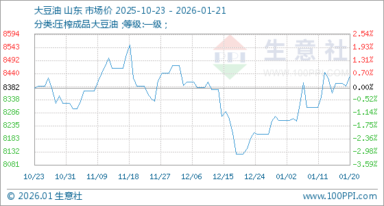 1月21日生意社大豆油基准价为8432.00元/吨