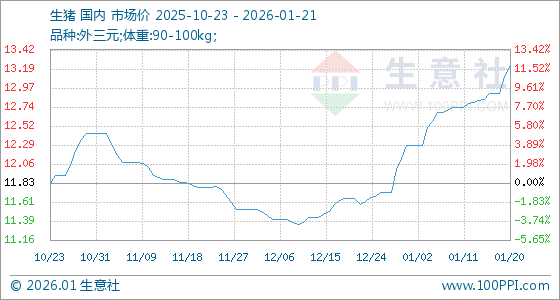 1月21日,生意社生猪基准价为13.23元/公斤,与本月初(12.28元/公斤)相比,上涨了7.74%。