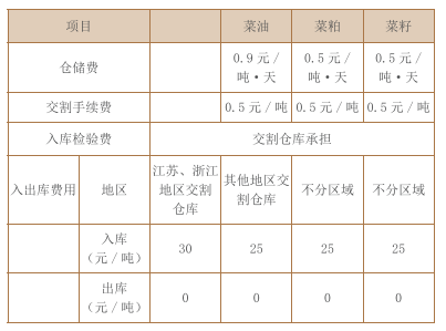 菜籽、菜油、菜粕的交割费用管理按照《郑州商品交易所期货交割细则》( 2019年3月版)执行。