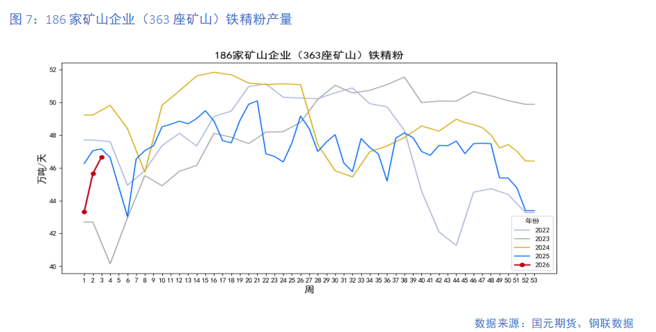 前期矿价坚挺,国产矿生产积极性改善。上周,186家矿山企业(363座矿山)铁精粉当周日均产量为46.67万吨/天,周环比增加2.23%。