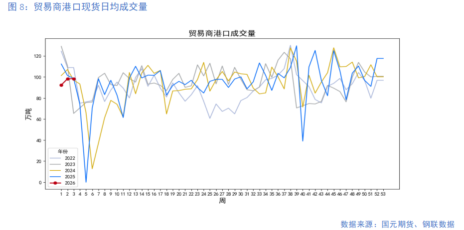 上周,贸易商中国主要港口现货日均成交量为98.4万吨/天,周环比增加0.10%;远期现货日均成交量103.2万吨/天,周环比下降15.69%。