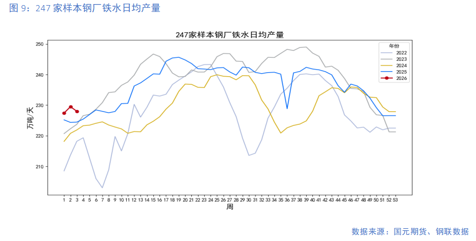 上周 ,247家样本钢厂盈利率39.83%,较上周变化2.17个百分点;247家样本钢厂高炉开工率为78.84%,周环比持平;247家样本钢厂铁水日均产量228.01万吨/天,较上周变化-0.65%。五大品种钢材当周产量819.21万吨,周环比增加0.08%;五大品种钢材表观消费826.12万吨,周环比增加3.68%;五大品种钢材库存为1247.01万吨,周环比下降0.55%。现货消费处于淡季,表现整体疲软,上中游仍以降库为主,冬储补库意愿较差。