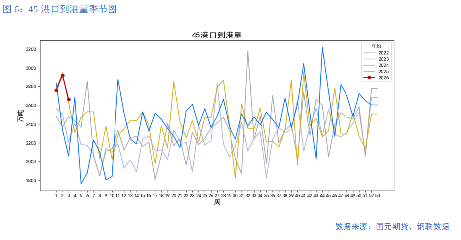上周,45港口当周到港量2659.7万吨,周环比下降8.93%。