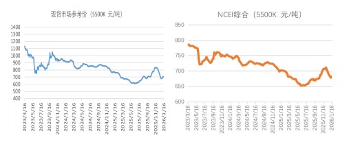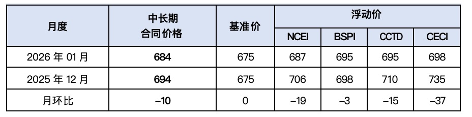本期动力煤价格走势呈现明显分化,中长期合同价格环比回落,现货价格小幅上行但涨幅收窄。依据“基准价+浮动价”机制,全国煤炭交易中心测算显示,2026年1月5500大卡下水动力煤中长期合同价格为684元/吨,较上月下降10元/吨,各浮动价指标同步走低,NCEI、BSPI、CCTD、CECI环比分别下降19元、3元、15元、37元。