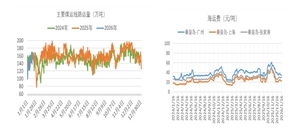 运输环节表现偏弱,集港效率虽有恢复但仍处低位。本期大秦、唐包、瓦日三条主要集港线路日均运量合计151.1万吨,较上期增加16.8万吨,结束五期连降走势,但较历史高位仍有显著差距。海运费持续回落,截至1月16日,秦皇岛至广州5-6万吨船运费降至33.6元/吨,周环比回落2.4元/吨。