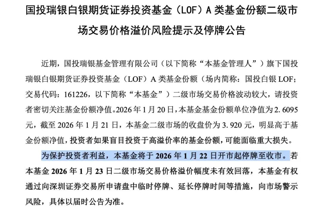 1月21日晚间,国投白银LOF基金(以下简称“本基金”)发布公告称,为保护投资者利益,本基金将于1月22日开市起停牌至收市。若本基金1月23日二级市场交易价格溢价幅度未有效回落,本基金有权通过向深交所申请盘中临时停牌、延长停牌时间等措施,向市场警示风险。