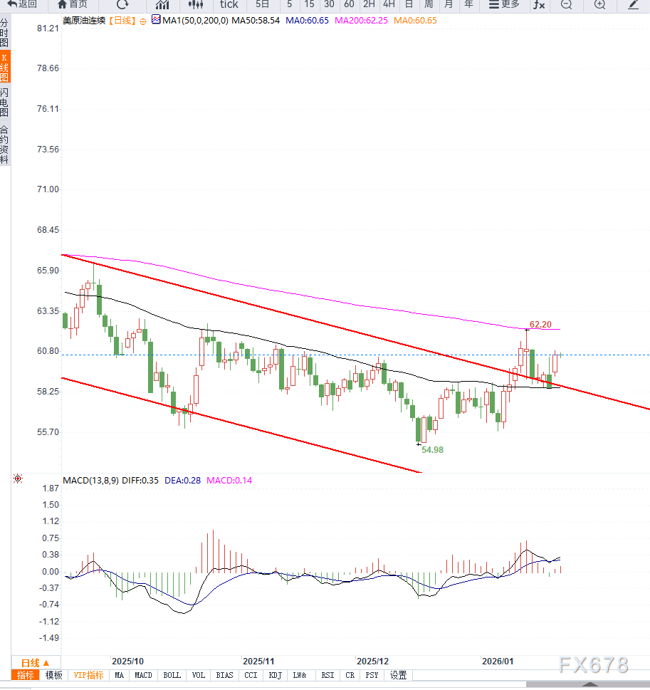 从技术面来看,WTI原油价格在60美元附近形成较强支撑,短期震荡偏强特征明显,但上方阻力在62–62.5美元区域较为明显。库存数据持续累积意味着供给侧压力未明显缓解,若短期库存增长继续超过预期,则油价可能再度回落测试支撑位。