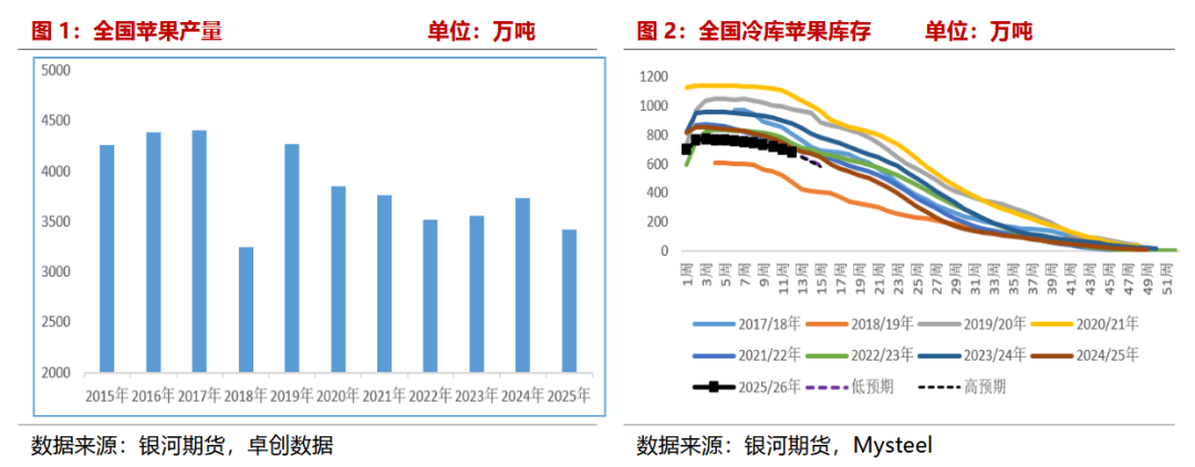 2025/26年度由于主产区春夏季干旱以及收获期持续降雨等天气因素导致苹果产量减少明显,本果季苹果产量预期偏低。根据卓创数据显示,2025/26果季全国苹果产量在3423.44万吨,较2024/25果季减少311.53万吨,同比减少8.34%,本年度苹果产量处于近些年低位,产量仅高于2018/19年度。主产区山东、陕西、甘肃都出现减产,小年特征明显,山西和辽宁今年产量同比增加。