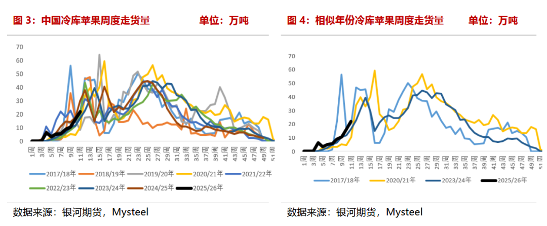 苹果需求有较强的季节性,一般而言春季前一个月左右苹果需求会出现明显增加,而今年春节时间推后,因此备货时间也有所推后。根据近些年除夕的日期统计可以看出来,2026年春节时间和2018年、2021年2024年时间相似,因此2025/26年度春节前的走货情况应该和2017/18年度、2020/21年度以及2023/24年度对比。通过对比相似年份的周度走货情况可以看出来今年苹果的走货启动时间和相似年份差不多,说明今年苹果的走货进度并不慢,基本上处于和相似年份相当的水平,因此我们从目前的冷库苹果走货情况来看,春节前苹果的需求尚可,虽然没有特别亮眼,但是也没有特别差。