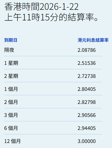 1月22日,港元拆息全线向上,而与楼按相关的一个月拆息终止四连跌报2.80405%,升7.512基点;反映银行资金成本的三个月拆息报2.90566%,升7.293基点。