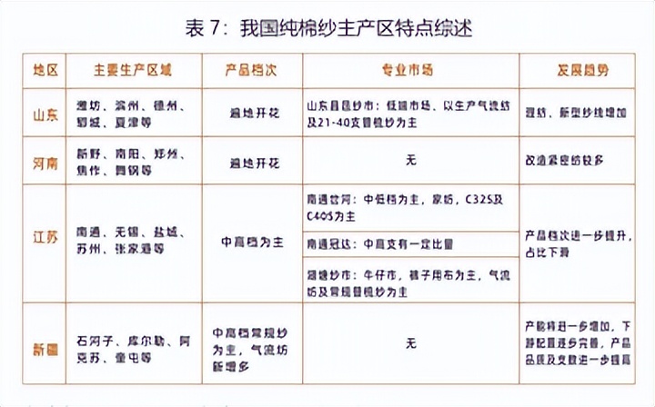 近几年棉纺织企业棉纱产量每年约600万吨,而表观费量接近800万吨,缺口主要靠进口棉纱弥补。产纱结构中占比最大的为纯棉纱,近年来涤棉纱和棉粘纱比例有所上升。纯棉纱中高支数占比稳定提高,纯棉纱产区主要集中在山东、新疆、河南、江苏四个省份,其中山东、河南产区棉纱生产覆盖所有品种,山东以生产低支纱线为主;江苏、新疆产区以生产中高档纱线为主,随着新疆地区棉花主产区优势的进一步凸显和一 带一路等 战略的推行,国内纺纱产能逐向新疆转移,新疆下游配置不断完善,产品品质和支数将进一步提高。