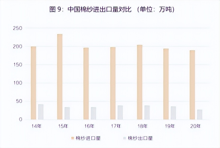 我国每年出口棉纱的量较少,一般仅占进口量的5%-20%左右,每年棉纱都是净进口状态。相对进口而言,我国棉纱出口量较小,这主要在于以下两个方面: 一是我国棉纺织产品出口主要集中在下游制品;二是棉纱生产成本的增加使出口订单加速向东南亚国家转移。2013年以来我国棉纱年净进口量多在150-200万吨之间。