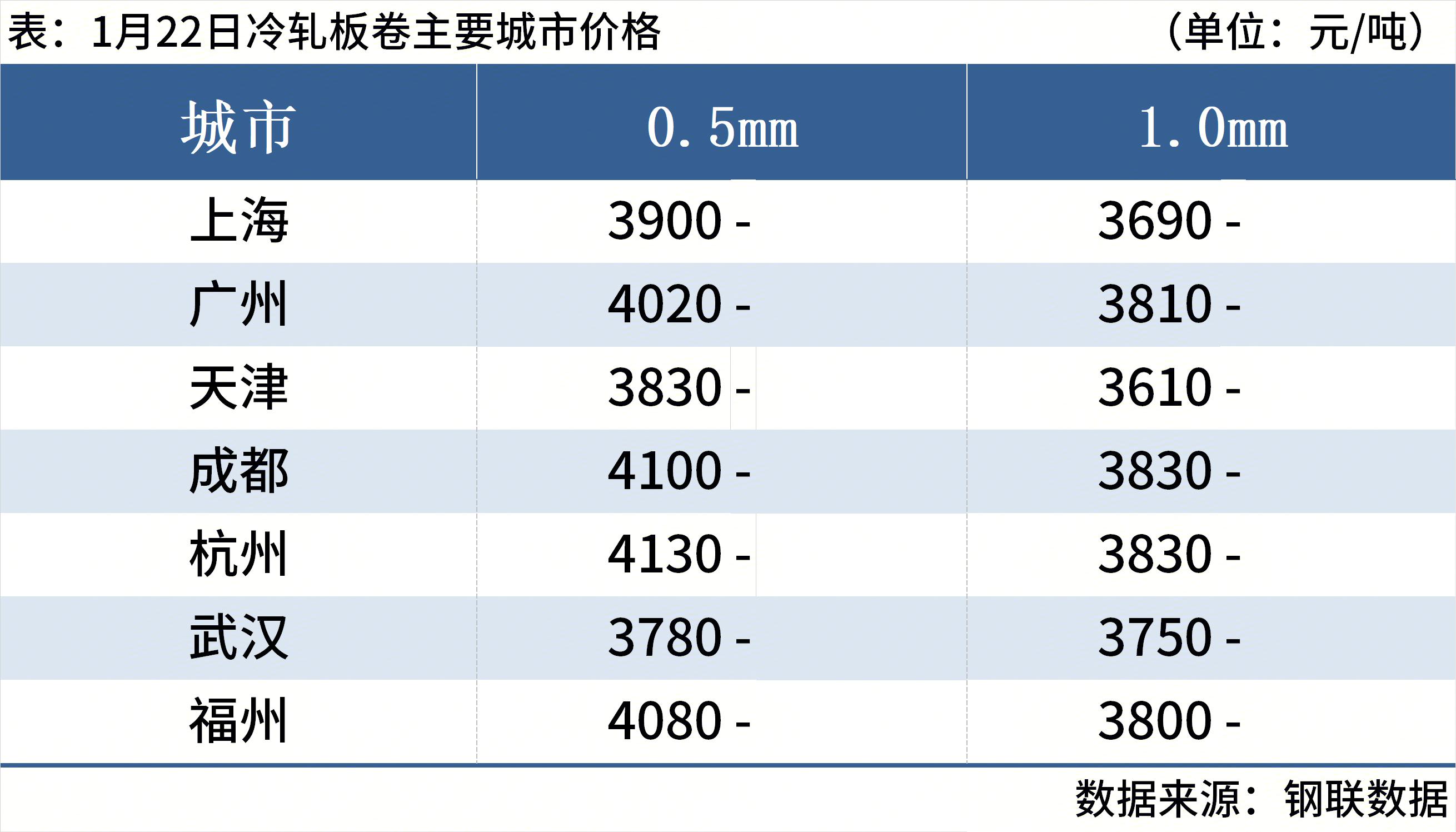 热轧板卷:1月22日,全国24个主要城市4.75mm热轧板卷均价3298元/吨,较上一交易日持平。原料端对热卷成本支撑松动,市场谨慎操作气氛继续占据主导,多数贸易商以控制库存、快进快出为主。1月份供给端产量增幅明显,但彼时终端需求呈现持续收缩态势,现阶段采购普遍转为按需补库,市场无法完全消化,社会库存相较去年同期水平高70万吨,短期价格将进一步承压。预计23日全国热轧板卷价格小幅下行。