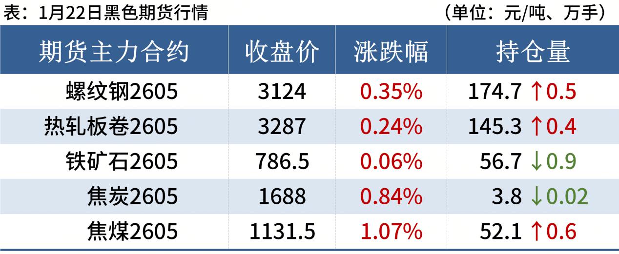 螺纹钢:1月22日,全国31个主要城市20mm三级抗震螺纹钢均价3318元/吨,较上个交易日上涨1元/吨。下游工程项目陆续进入收尾阶段,采购积极性下降。同时冬储临近,节前市场价格偏高,贸易商对于冬储预期信心略有不足,备货观望情绪增加,市场或陆续进入平稳过渡阶段。因此,预计23日国内建筑钢材价格或将继续窄幅震荡为主。
