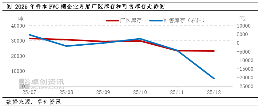 2025年12月PVC糊市场供需关系处于紧平衡状态。截至12月底,样本企业可售库存为-2.06万吨,环比下降1.641万吨,显示预售订单充足;厂区库存则稳定在2.34万吨,环比基本持平。供需结构的改善主要得益于两方面因素:第一,政策面企稳,11月起中美关税延期一年执行,市场情绪好转,手套料及大盘料出口逐步恢复,下游采购积极性提升;第二,企业主动去库,部分工厂在11月中旬下游订单回升时,采取降价促销策略,加速库存消化。