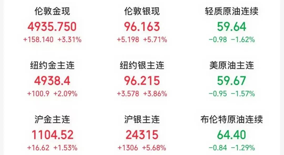 贵金属方面,伦敦金现货价格收涨3.31%,报4935.75美元/盎司;伦敦银现货价格大涨近6%。沪金、沪银主力合约也大幅上涨。