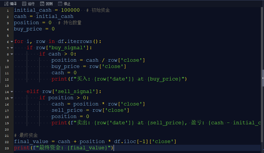 编写回测策略通常包括定义买入和卖出的条件。以下是一个简单的示例策略: