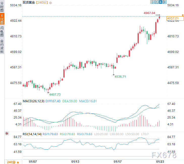 格陵兰主权争议的最新进展对黄金市场的影响主要体现为强化其避险逻辑。周五亚市时段,现货黄金温和上涨,延续了前四个交易日的涨势,现交投于每盎司4955美元附近,早盘时段一度刷新4967.13美元/盎司的历史新高,日内涨幅约0.4%。