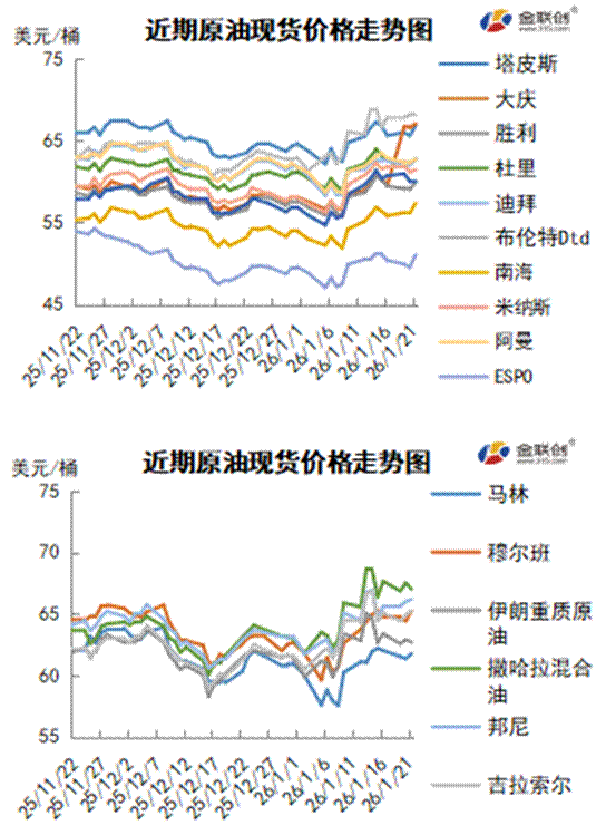 金联创预计下周(1.22-1.28),严寒天气正对馏分油需求形成提振作用,且地缘政治的不确定性仍对油市有所支撑。特朗普取消因格陵兰岛主权问题对欧洲八国征收关税,在很大程度上缓解了贸易紧张情绪。综合来看,下周国际原油价格或以震荡小涨为主。