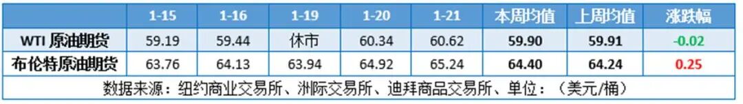 本周(1.15-1.21),国际原油价格整体呈现区间震荡的走势,周度均价环比涨跌不一。WTI均价59.90美元/桶,较前一周下跌0.01美元/桶,或-0.02%。周内,导致油价承压的因素有:美国推迟对伊朗的军事行动以及美国销售委内瑞拉原油。对油价起到支撑的因素有:地缘局势紧张以及哈萨克斯坦原油供应减少。