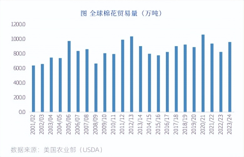 全球棉花的贸易量在最近二十年来波动较大,总贸易量平均约850万吨,在600-1100万吨内波动,棉花贸易量约为棉花消费量的30%。