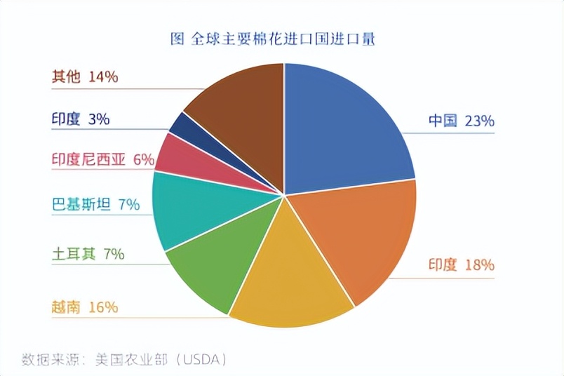 全球主要的棉花进口国分别为:中国、孟加拉、越南、耳其、巴基斯坦,.上述 5个国家棉花进口量约为全球棉花进口总量的80%。其中,中国一直是全球最大的棉花进口国、最大的纺织服装出口国。孟加拉、越南是全球纺织服装的主要出口国,因其国内基本不生产棉花,主要棉花消费基本全部依赖进口,在全球棉花贸易中具有较大影响。