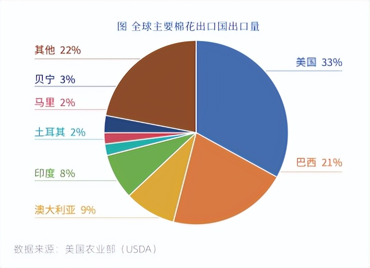 全球主要的棉花出口国为美国、巴西、澳大利亚、印度、土耳其,上述5个国家棉花出口量约为全球棉花出口总量的75%。其中,巴西棉花产量持续提升,在全球棉花贸易中的比重越来越大,出口棉花的数量与美国基本相当,并有望超越美国成为全球最大的棉花出口国。而印度正逐渐从棉花净出口国转变为棉花进出口相对平衡的国家,市场预计,印度将有可能变为棉花净进口国。