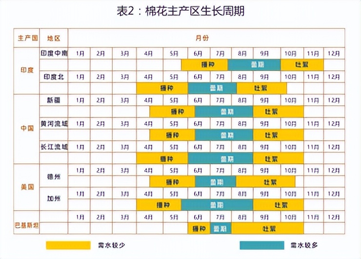 根据各阶段温度和需水特点,将播种、出苗期和苗期归为同一阶段,以“播种”显示;将蕾期和花铃期归为同一阶段,以“蕾期”显示。其中印度、中国、美国和巴基斯坦四大棉花主产区生长周期如表2所示。全球主要棉花输出国因所处的纬度和气候不同,其棉花生产期和收获期存在明显差异。由于全球棉花收获持续时间跨度大多为当年的8月至翌年的7月,因此USDA习惯以市场年度表示棉花产销,如2018/19国际市场年度就是指2018年8月至2019年7月这段时间,我国的棉花收获基本从9月开始,国内市场年度区间指当年的9月至翌年的8月。