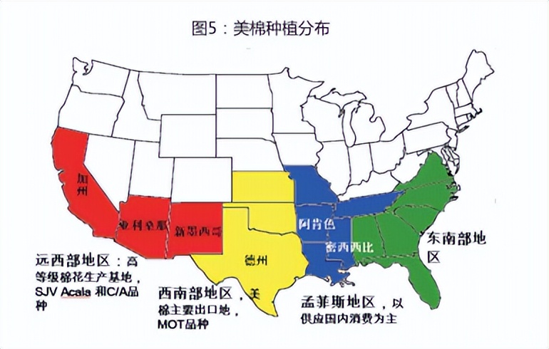 美国农业具有专业化的特点,棉花种植90%集中在棉花带,位于北纬35%以南的美国东南部,东起大西洋沿岸的北卡罗来纳州,西到加利福尼亚州东部。气温高,无霜期长,土壤肥沃,有利于棉花生长。美棉品种以陆地棉为主,长绒棉为辅。按照气候特征和地域特点划分为西部棉区、中南棉区、东南棉区和西南棉区。