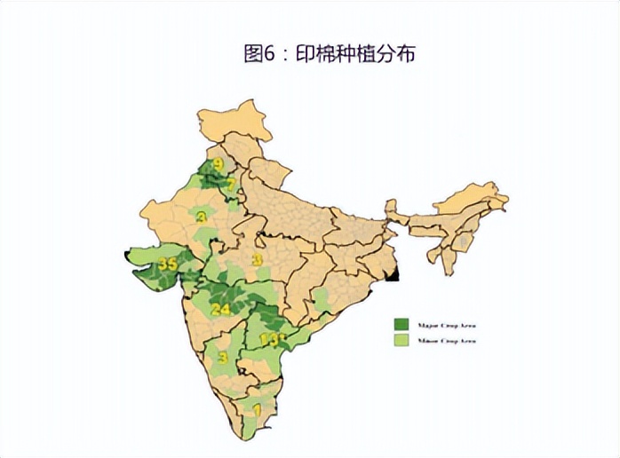 受季风环流的影响,大部分棉区自6月中旬起开始出现西南季风,季风途经暖湿的印度洋洋面,带来大量水气,形成明显的季风雨,-年可分为四季,冷季( 12月-次年3月)、热季(4-6月)、雨季( 7-9月)和西南风退却季( 10-11月),生产上一般把雨季以外的三季称为旱季。按照地域、生态区印度棉区可分为中部、南部和北部三个棉区,其中中部棉区种植面积约占全国的61.6%,其次是南部棉区,占全国的24.3%,再次是北部棉区,占全国的12.4%。北部棉区地处亚热带干旱、半干旱地区,包括旁遮普邦、哈里亚纳邦和拉贾斯坦邦,其中哈里亚纳邦产棉最多,占比超过该区的40%。北部棉区是印度三个产棉区产量最高的一个,主要原因是该棉区大多为河流冲击土,土质较好,人工灌溉条件好,以及良种良法的普及。播种期大多为西南季风来临前的4月中旬-5月底,收花期为9-11月,其中拉贾斯坦邦稍迟,播种期为5-7月,收获期为9-12月。北部棉区生产的主要限制因素:灌溉水源不足往往导致花铃期受旱,灌溉体系不配套,一些棉田只灌不排,或者排水不畅,严重棉田甚至不得不改种水稻等其它作物,使用合格种子比率较低。