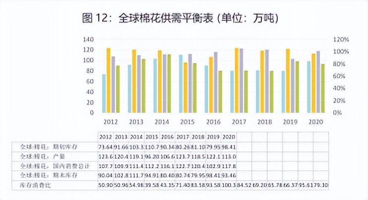 棉花的产量与库存量是棉花供给的两个主要因素,与棉花价格具有反向关系。1961年以来,世界棉花面积基本在4.5-5亿亩之间波动。由于科技水平的提高,棉花单产不断增加,世界棉花总产量由1000万吨增加到2700万吨左右,棉花生产集中在中国、美国、印度、巴基斯坦等国。根据USDA2021年4月棉花供需月报预测,2020/21年度全 球棉花产量2461万吨,全球消费2565万吨,全球棉花产小于需104万吨,除2019/2020年度之外,产需缺口同比扩大。全球期末库存2035万吨,全球库消比79.3%。全球前七大产棉国依次为印度、中国、美国、巴西、巴基斯坦、乌兹别克斯坦和土耳其,共占全球棉花产量的84.1%。自2011/12年度,全球棉花消费量稳步增加,促进消费增长的最主要因素是全球人口的增加和人均收入的增加,全球前七大棉花消费国依次为中国、印度、巴基斯坦、孟加拉、越南、土耳其和巴西,其中中国和印度两国的消费量之和占到了全球棉花消费量的一半以上。2020年,全球范围内爆发新冠肺炎,棉花消费量受到严重影响。据USDA2020年4月份报告显示,2019/2020年全球棉花消费量为2240万吨,同比下降14.5%; 2020/2021年度,随着全球宏观经济的复苏以及新冠疫情的有效控制,全球棉花消费量同比显著恢复,为2565万吨,相比上个年度大幅增加14.5%。