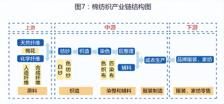 在棉纺织行业产业链中,上游是指纺织纤维的生产,提供纺织品生产所用的原材料;中游是指棉纺织品的织造、染整和辅料、服装制造环节,通过纺纱、织造、染色、后加工、成衣生产等过程使纤维原料变成纺织成品:下游是指棉纺织品的销售流通环节,通过各种销售渠道使服装、家纺等纺织品进入终端消费者手中。纱布产业细分多,设备、工艺、原料配比皆可独立为一个分类,就棉纱而言,下游坯布厂家往往根据自己产品的不同需求进行订单式的采购。
