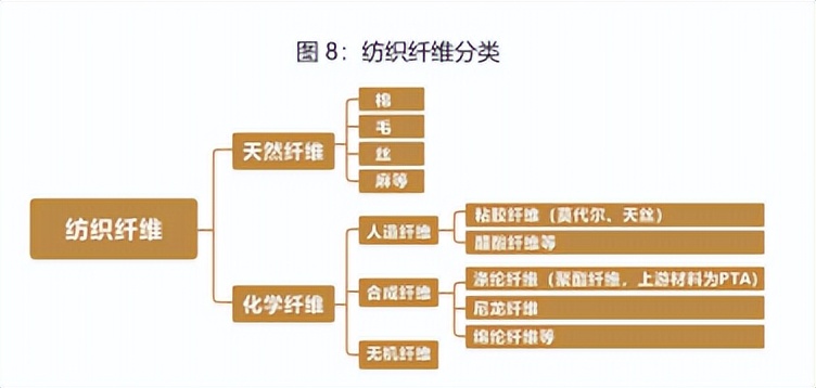 纱是指用各种纺织纤维加工成一定细度的产品,用于织布、制绳、制线、针织和刺绣等。原料端纺织纤维可分为天然纤维和化学纤维两类,化学纤维又可以进一步分为人造纤维、合成纤维和无机纤维三类。人造纤维是指用某些天然高分子化合物或其衍生物做原料,经溶解后制成纺织溶液,然后纺制而成。纤维,竹子、木材、甘蔗渣、棉籽绒等都是制造人造纤维的原料,根据人造纤维的形状和用途,分为人造丝、人造棉和人造毛三种。合成纤维是指以石油、煤、天然气及一些农副产品为原料纯化学合成的高聚物。