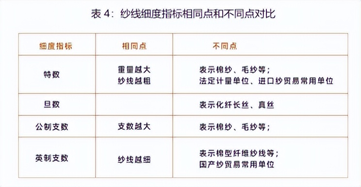 由于纤维截面积不规则,且纱表面有毛羽不易测量,只用直径无法精确表示纱线的粗细程度。在生产销售中,企业普遍采用定长制和定重制两种表示方法,引入特数、旦数、公制支数和英制支数四个指标。