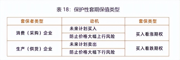 期权套期保值基本策略包括保护性(买入期权)套保、抵补性(卖出期权)套保和双限(同时买卖期权)套保。商品买家需要对冲商品价格上涨风险,而卖家需要对冲价格下跌风险,根据价格变动方向、变动幅度、保值成本及目标需要,买家和卖家可以有多样化的套保选择。
