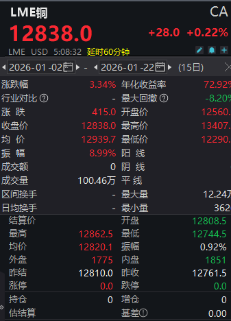 数据显示,截至北京时间1月22日14时08分,LME铜报12838美元/吨,涨0.22%,年内累计涨幅为3.34%。