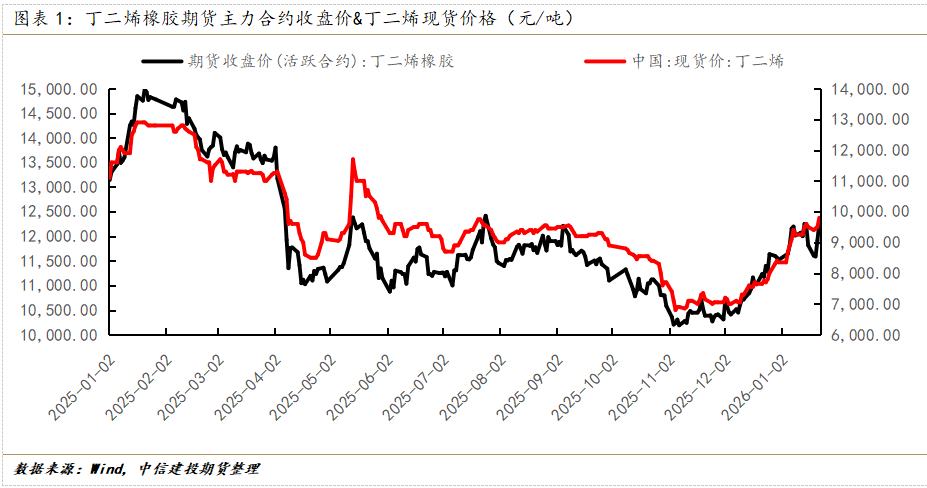 进入2026年之后,丁二烯橡胶延续自2025年年末以来的强势,迎来2026年第一个涨停板。截至1月22日夜盘收盘,丁二烯橡胶主力合约BR2603合约报收12930元/吨,较上一日交易日收盘价涨幅5.38%,2026年以来涨幅6.51%;丁二烯现货价格报收9800元/吨,涨幅3.16%,2026年以来涨幅17.37%。