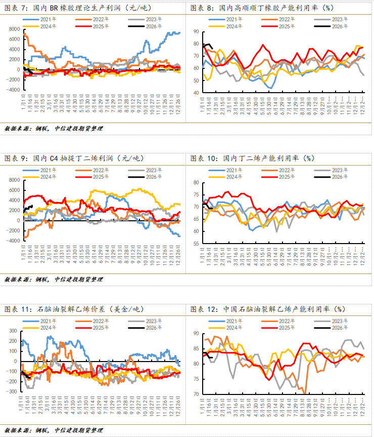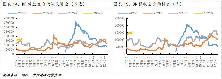 在给出展望之前,回顾一下BR橡胶这张合约的一些特点。第一,由于BR橡胶位于石化行业贴近下游消费品的位置,也就代表BR橡胶仅是上游化工原料以及一次能源中的一个较小的市场,全球市场规模不足百亿美金(大约60亿美金左右,应该是目前国内上市的化工品期货中全球规模最小的一个产品);第二,承接上述内容,由于BR橡胶的规模较小,导致BR橡胶的平衡表(以及平衡表的预期)相对更易出现不可调节的矛盾,导致单边价格始终剧烈波动,自2023年7月上市到2026年的4个年度内,每一年均出现涨停板。截至1月23日盘中,BR橡胶全合约大幅增仓进4.6万手,全合约流入资金超6亿人民币(做个对比:1月23日沪铜全合约流入资金超75亿人民币,涨幅约0.34%)。因此,BR橡胶的单边行情始终伴随高赔率属性,甚至是超高赔率。