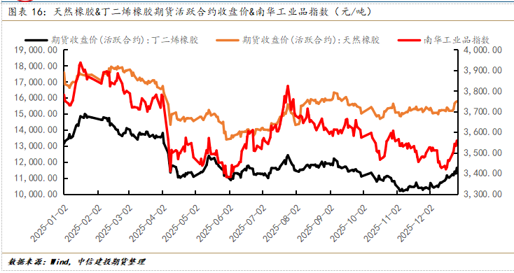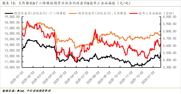 关于这一轮BR橡胶行情做一些特征的总结。第一,反弹的幅度较大,截至2026年1月23日盘中,2025年全年的跌幅几乎全面收复;第二,反弹的速度较快,自2025年12月初起,本轮强势反弹仅耗时大约40个交易日的时间,第三,反弹相对流畅,自2025年12月初起,在大约40个交易日内,仅2026年1月16日当日跌幅超过3%,其余交易日跌幅均为超过2%。因此,本轮行情的体感冲击相对强烈(涨的多、涨的快、涨的顺)。