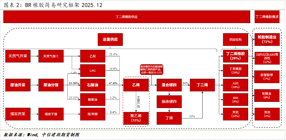 还是先给出关于BR橡胶的简易框架,关于框架的具体内容不再展开。主要想说明:第一,BR橡胶供应溯源较复杂;第二,化工企业几乎不会为了单独生产BR橡胶(或者BD,丁二烯)去提高一体化装置的开工负荷。