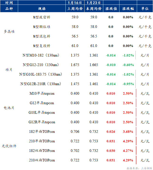 多晶硅市场延续清淡格局,无大规模成交,买卖双方博弈进入深度僵持阶段。尽管硅料企业仍在维持报价,但下游硅片厂普遍暂缓采购、压价观望,实际成交极为有限。现货市场仅见少量期现商走货,报价已下探至48–50元/千克。下游需求疲弱叠加一季度传统淡季,硅片企业开工意愿低迷,对高价硅料接受度极低。与此同时,据Mysteel调研,随着头部企业停产开始执行,部分企业跟随减产,1月多晶硅产量不足9万吨,2月排产或将维持在8万吨以内,供应收缩初现,但尚不足以扭转供需失衡局面。
