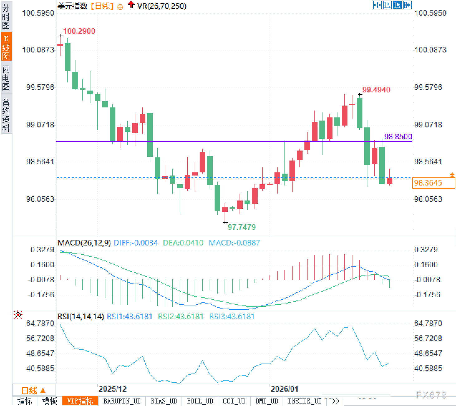 汇通财经APP讯——周五(1月23日)美元指数欧洲时段交投98.35附近,仍在近期低位98.23附近徘徊。虽然美国总统特朗普近期释放出缓和欧美紧张关系的信号:撤回对部分欧洲国家加征10%关税的计划,并与北约秘书长就格陵兰及北极地区达成“未来协议框架”,一度让美元出现小幅反弹,但这场上涨来得快去得也快。市场很快意识到,这些动作更像是“口头止痛药”,并未真正解决深层次的地缘与联盟信任问题。所谓的“框架协议”听起来体面,但缺乏具体执行路径和法律约束力,交易员更愿意将其视为短期情绪安抚,而非结构性风险下降。